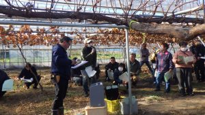 研修会は、常陸太田ぶどう部会員2名の圃場において、園主、県園芸研究所の主任研究員、農業総合センターの主任専技が講師となり、シャインマスカットの「短梢剪定 無核栽培について」、BKシードレスの「短梢剪定 無核栽培について」について実演も交えながらの説明と事前質問への回答があり、参加者は熱心に耳を傾けるとともに、圃場を観察しながら意見交換も活発に行われ、来年産に向けて有意義な研修会となりました。