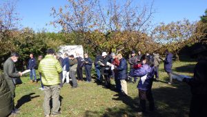 また、ほ場見学では、農業総合センターの主任専技、園芸研究所の研究員を講師に迎え試験ほ場のクリ樹の栽植や品種について説明がありました。特に剪定の効果を示す例として無剪定樹、剪定樹を実際に見比べ、剪定により樹勢が強くなり樹幹も太くなっていること等見学しました。