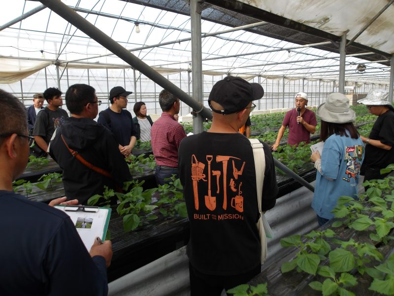 続いて大葉のハウスを見学し、代表の矢澤氏から栽培方法やコスト管理、従業員体制などについて説明があり、参加者からの「夏場の暑さ対策」や「一日の出荷量」などの色々な質問に答えていただきました。