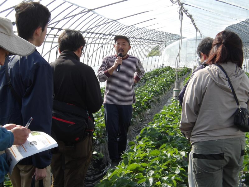 イチゴ、ナシ共に実際の圃場でお話しを伺うことで、萩谷氏の話の内容をイメージしやすく、参加者からは具体的な質問が数多くあがりました。