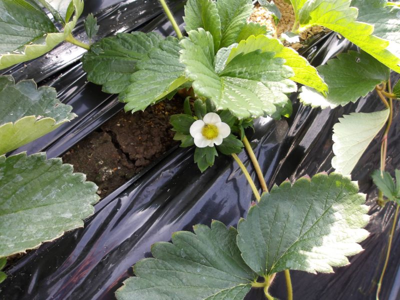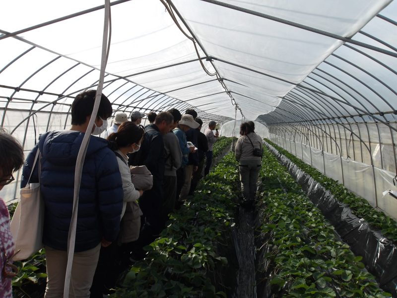 まず始めにイチゴのハウスを見学しました。11月とはいえ、ハウスの中は日が差し込みとても暖かでした。定植されたイチゴの苗を見ながら、園主である萩谷浩司氏からイチゴを栽培するうえで工夫していること、気をつけなければいけないこと等のお話しを伺いました。