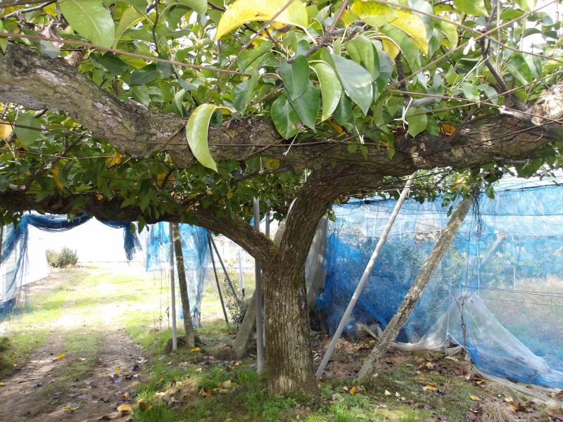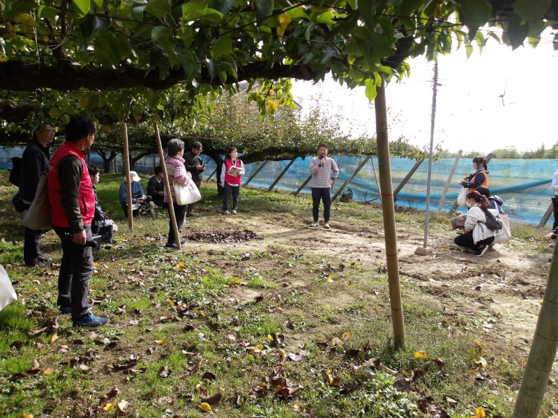 次にナシ棚の下に移動し、県内でも有数の果樹産地である常陸太田市で安定した収益を得るためのコツ、病害虫や自然災害による被害リスクが高いナシをどのように管理しているか等のお話しを伺いました。